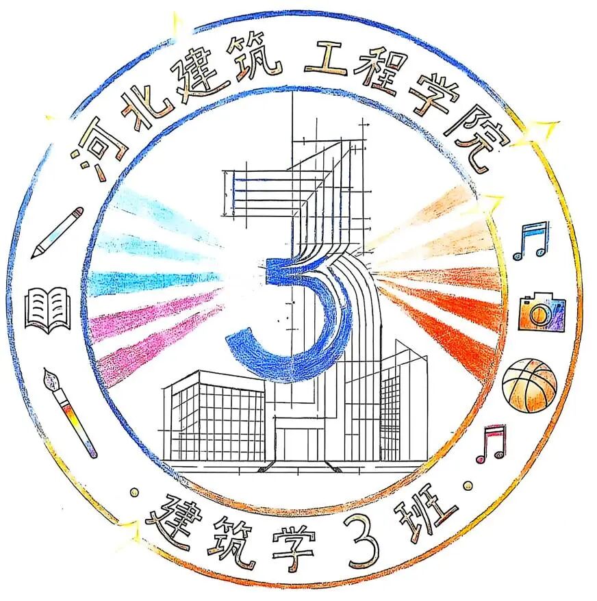 建筑学3班班徽,以"3"字为核心,巧妙融合建筑图纸线条与立体建筑轮廓,既彰显专业特色,又寓意严谨与创新的统一。彩虹光束向两侧延展,左配画笔、书本、铅笔,右缀音乐、摄影与篮球,象征学术与艺术、文体的多元融合。整体设计以暖金色为基调,搭配多彩光线,既传递学院严谨学风,又展现班级积极向上、全面发展的精神风貌,让每一位同学在知识与创意的双轮驱动下,绘制属于自己的建筑蓝图。
