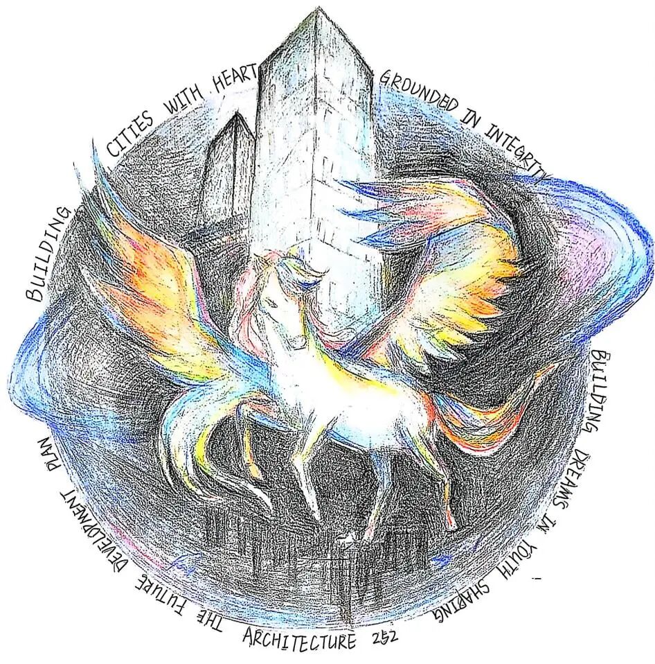 “用‘梦想’赋予城市建筑诗意与活力”。建筑不止是功能,更是情感与想象的载体。 飞马→创意/浪漫/想象。现代建筑→现实/理性/城市。色彩漩涡→梦幻联结。