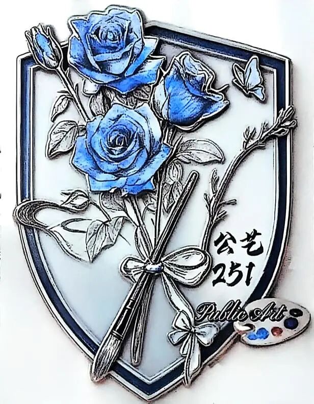 这枚公共艺术251班班徽,设计充满巧思与艺术气息。盾牌造型寓意守护与凝聚力,是班级共同体的精神象征。蓝玫瑰的选取极具深意,蓝色玫瑰本身稀有且富有梦幻感,代表公共艺术专业追求独特创意、打破常规的艺术理念,也暗示着同学们在艺术道路上对极致与创新的追求。