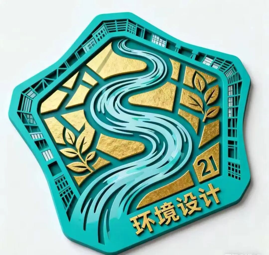 班徽以独特的多角形轮廓呈现,边缘的建筑剪影元素,直观体现环境设计专业对建筑空间塑造的学科属性。中间蜿蜒的河流象征着设计思维的灵动流转与对生态环境的关注,金色的地形与植物纹样,寓意着在环境设计中对自然肌理的尊重与艺术化表达。数字“252”与“环境设计”字样,明确班级身份。整体以蓝绿与金色搭配,既展现环设专业对生态环保的追求,又彰显班级的专业质感与活力,传达出环设252班在环境设计领域,以创新思维融合自然与建筑,打造宜居空间的愿景。