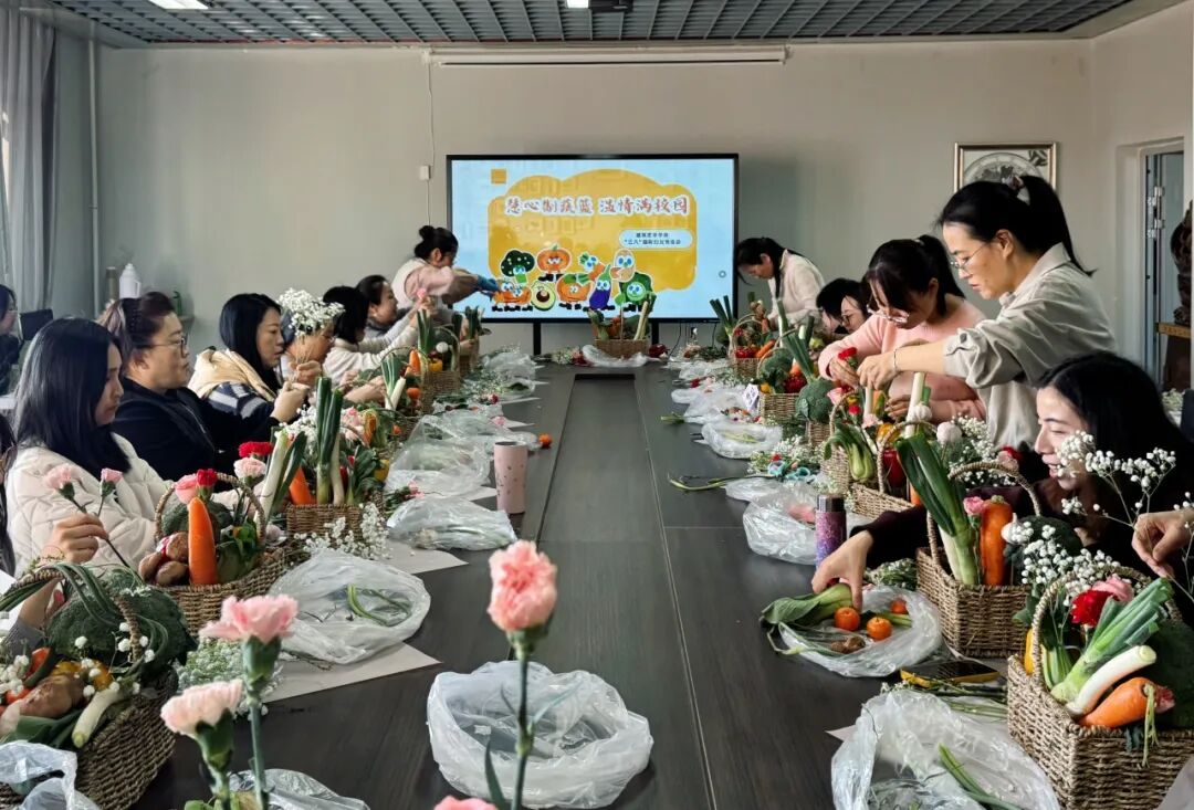 为热烈庆祝“三八”国际妇女节,丰富女教工精神文化生活,3月10日,建筑与艺术学院在明德楼717会议室开展“慧心制蔬篮,温情满校园”蔬果花篮制作活动,学院30余名女教工齐聚一堂,在创意创作中欢度节日。